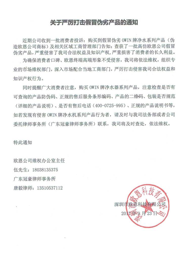 同时提醒广大消费者注意,购买OWIN牌净水器系列产品,注意检查是否有可查询的产品防伪码、正规的售后服务条形编码、产品的二维码、包装是否规范(详细的产品说明)、是否有售后电话(400-0725-995)、正规的产品说明书等,如若发现有侵害OWIN牌净水机系列产品行为者,请及时与我司法务部或者公司委托律师事务所(广东冠豪律师事务所)联系,我司将及时查处,依法维权。