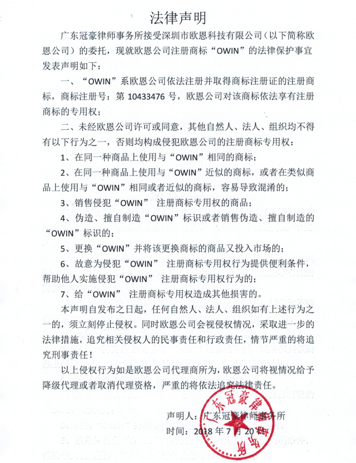 近期,owin公司发现一些不法、不良厂商在对我欧恩(OWIN)公司品牌侵权,国内某些非法厂商未经我公司授权,非法生产、销售“OWIN”品牌的产品,伪造我公司商标以及产品标签贴在其产品上,不但严重侵犯了我公司的合法权益,损坏了owin公司的品牌信誉,同时也为广大客户带来了严重的安全隐患和质量事故,严重损害了owin公司受法律与知识产权保护的基本权利,侵害了我公司的正当利益。owin公司将对侵权假冒产品依法进行查扣外,对模仿owin公司专利产品的行为,owin公司也将一同进行法律与经济上的追究与诉讼。