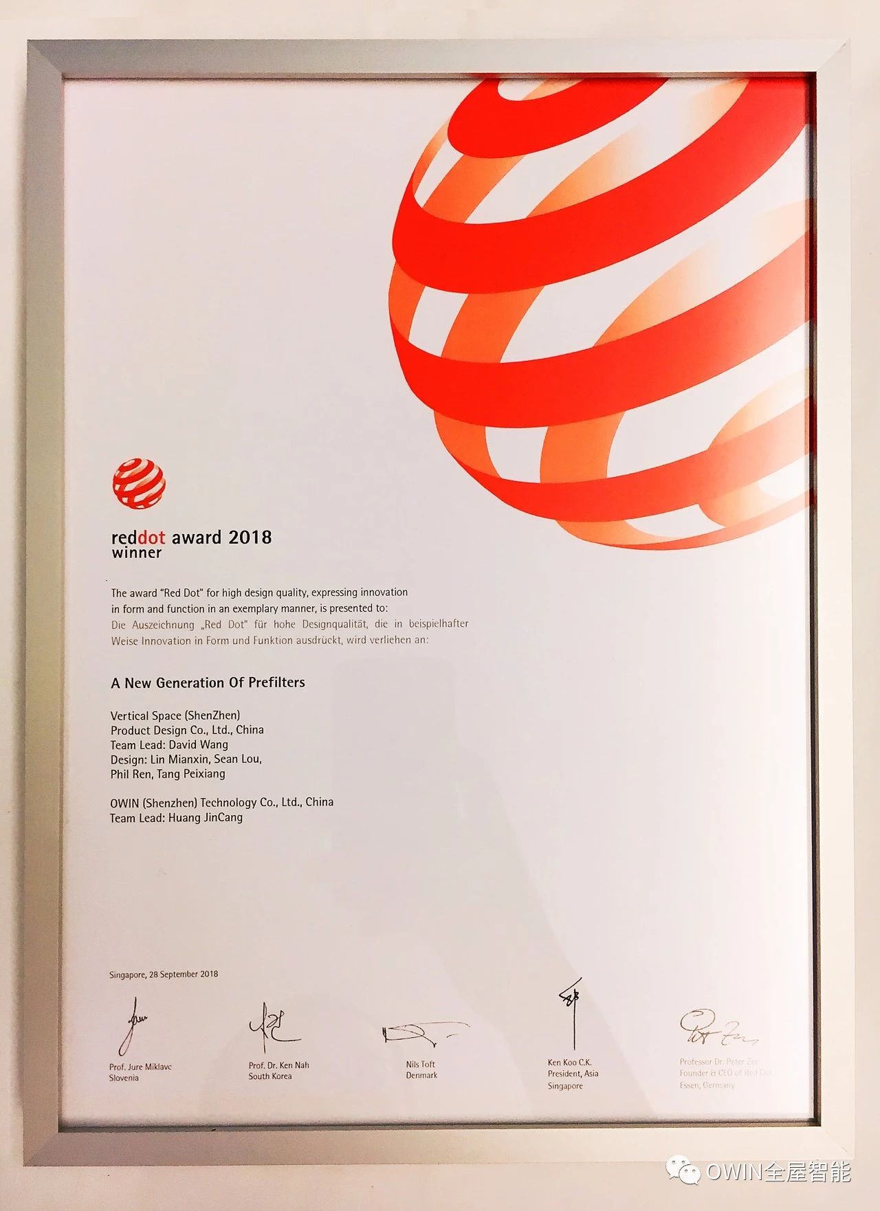 OWIN凭借创新的设计理念,得到红点设计奖,作为国际公认的工业设计领域的奖项,红点奖代表着对一个产品工业设计水平的高度认可。
